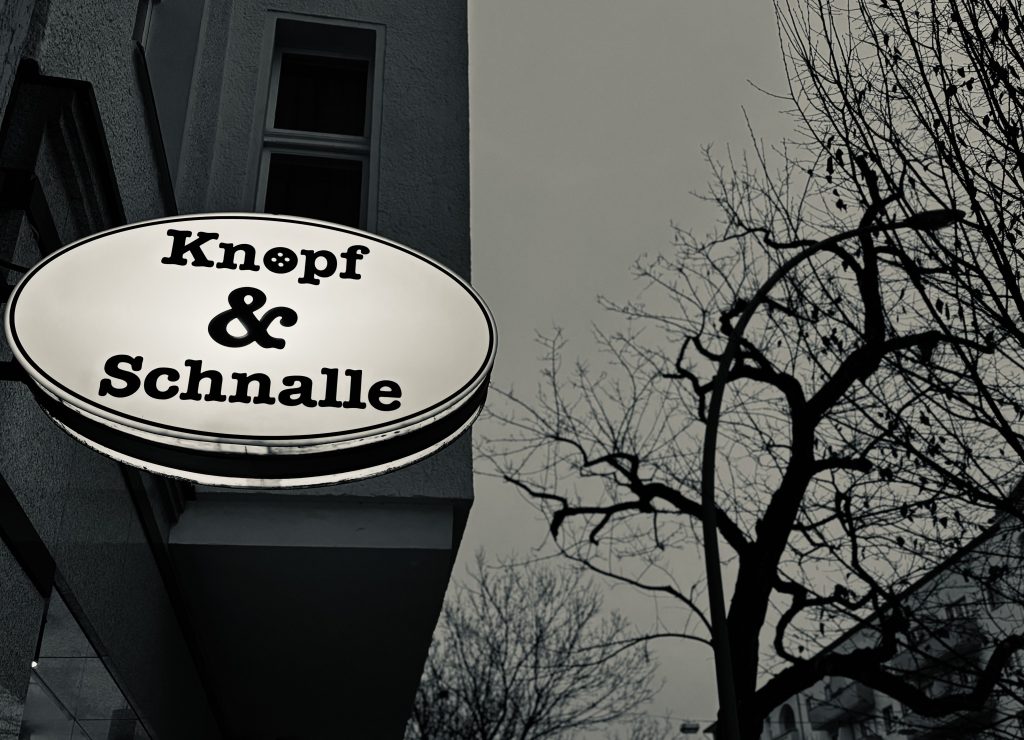 Also los. Zuerst nach Hause – Stoff holen und Knöpfe beziehen lassen. Eine der wenigen Adressen dafür ist die Inhaberin von Knopf und Schnalle.