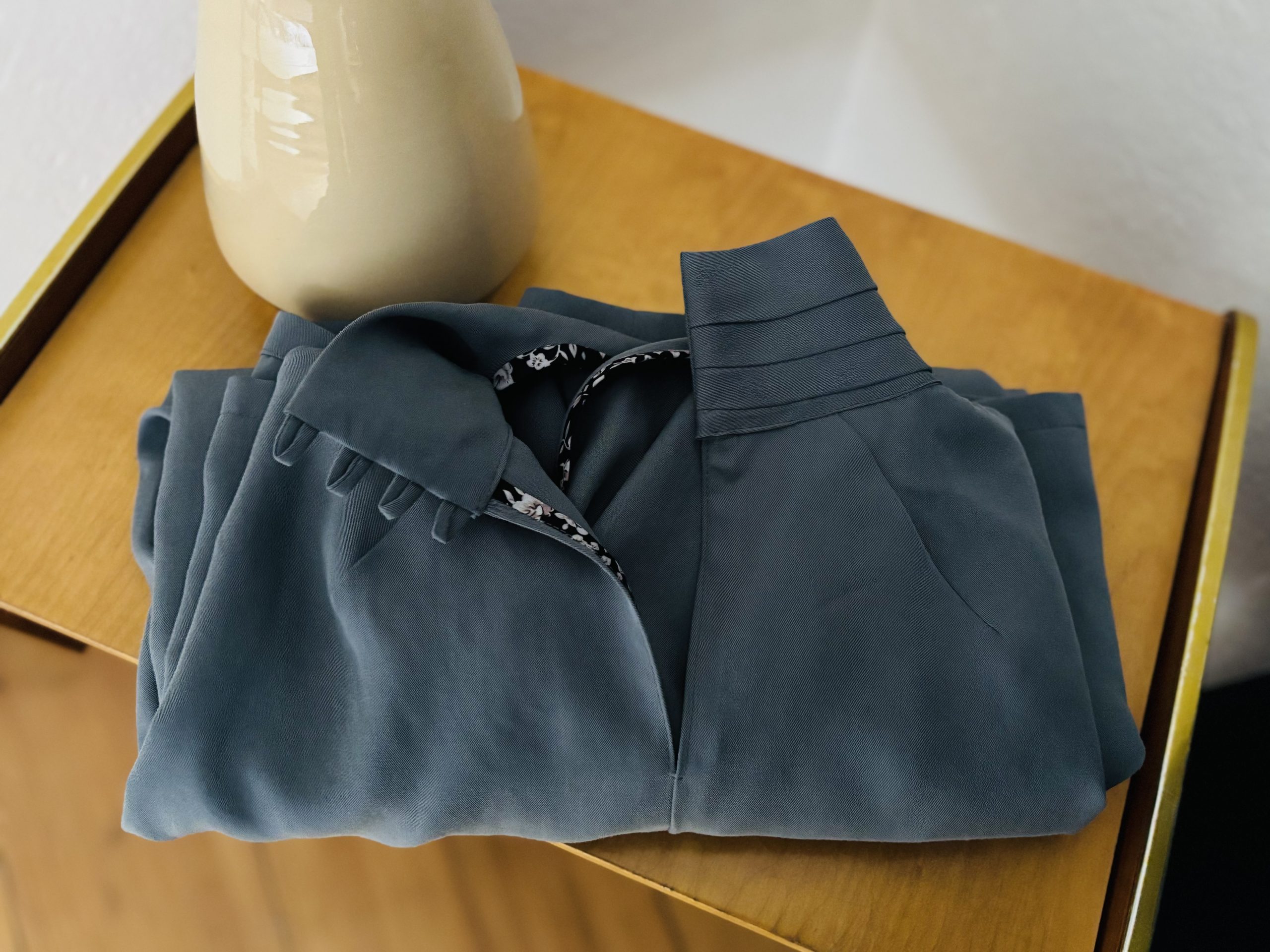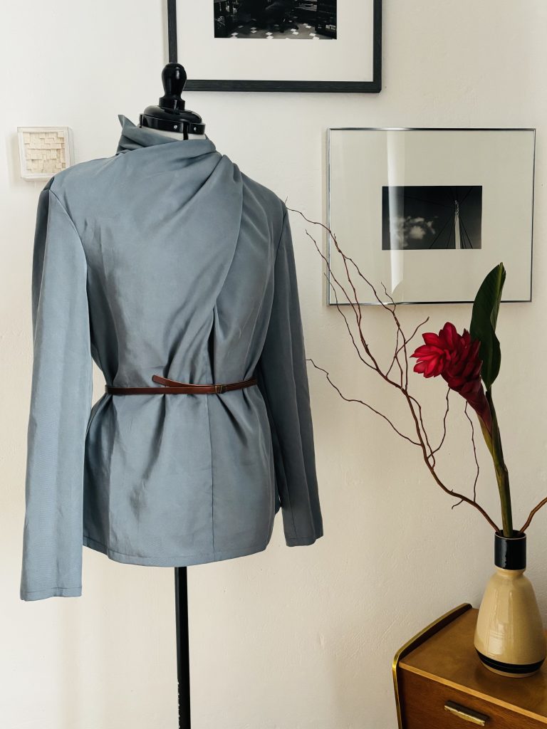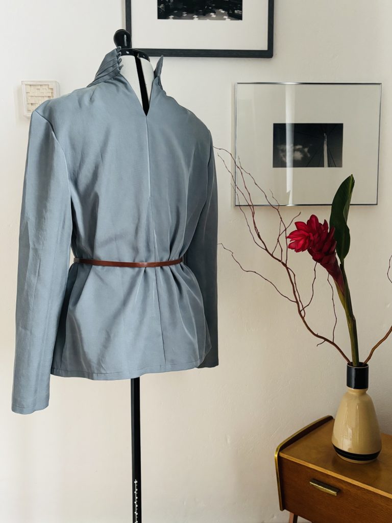 Im Januar hatte ich voller Enthusiasmus begonnen. Inzwischen ahne ich, warum ich im Netz kaum Umsetzungen gefunden habe. Das Probemodell zeigte schnell: Sumaya funktioniert nur in einem begrenzten Rahmen – sowohl in Bezug auf Passform als auch auf den Stoff. Brusttiefe und Schulterneigung müssen genau stimmen, sonst würgt die Drapierung (optisch) oder die Bluse kollabiert im Schulterbereich (sie ist für Polster konstruiert).