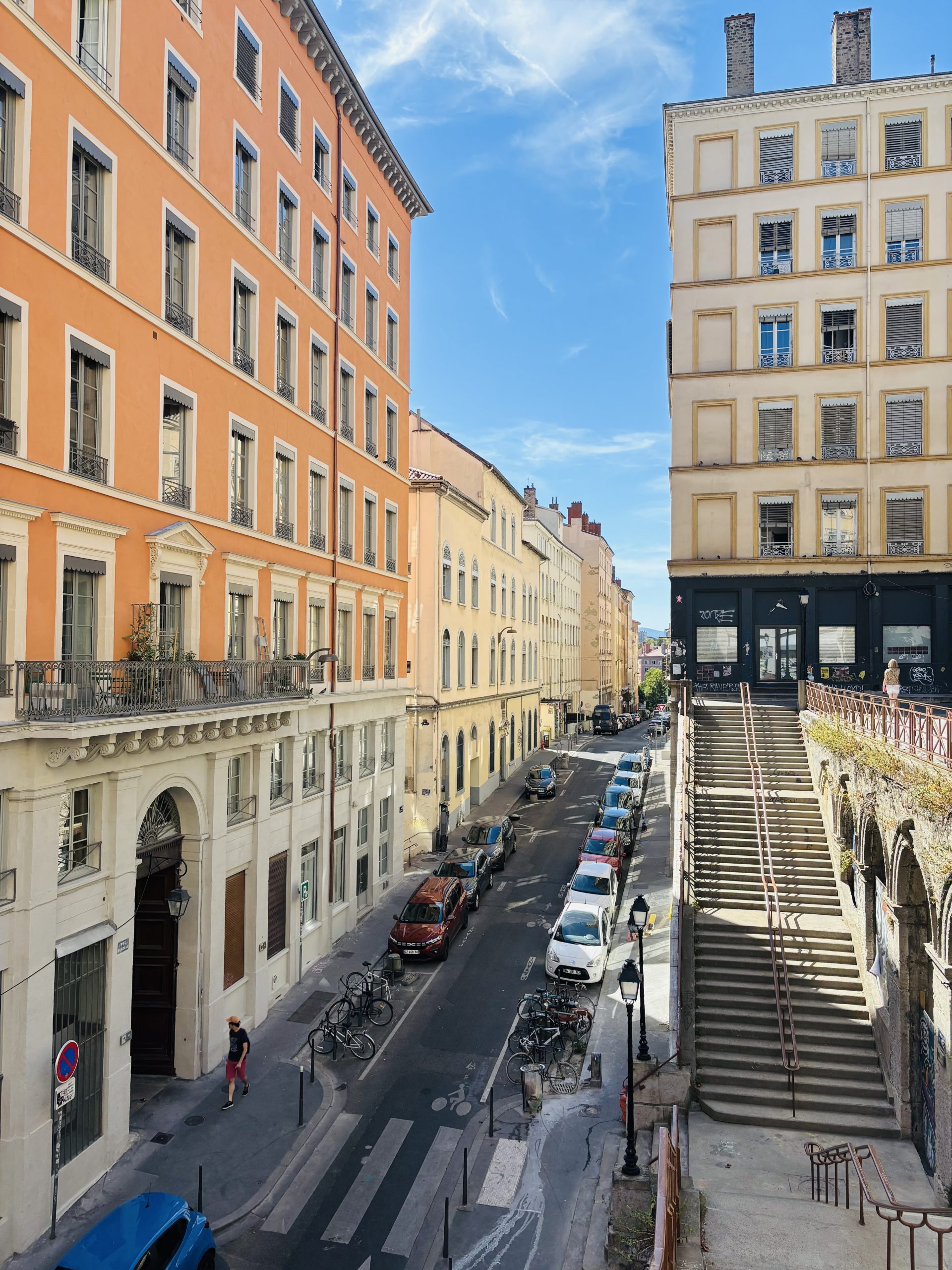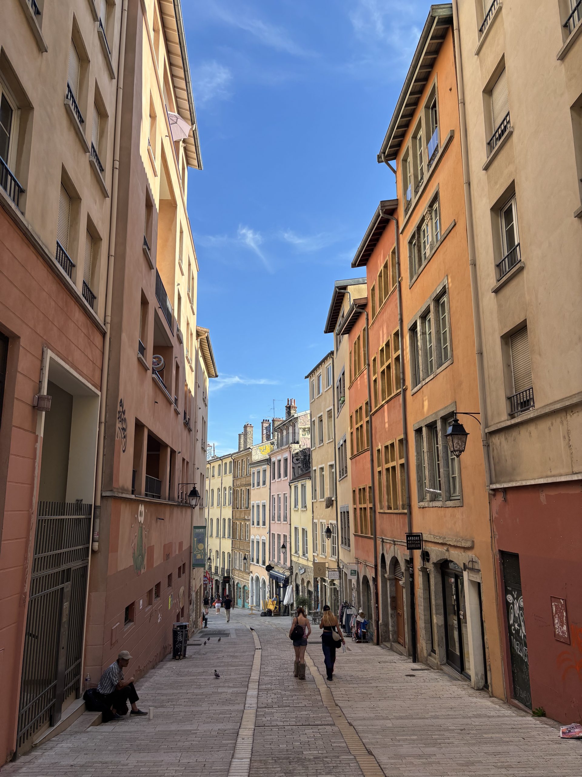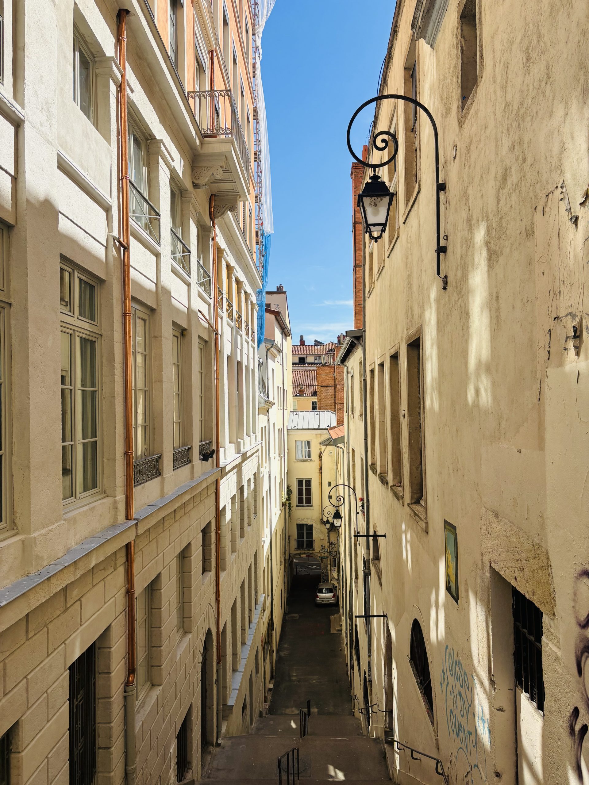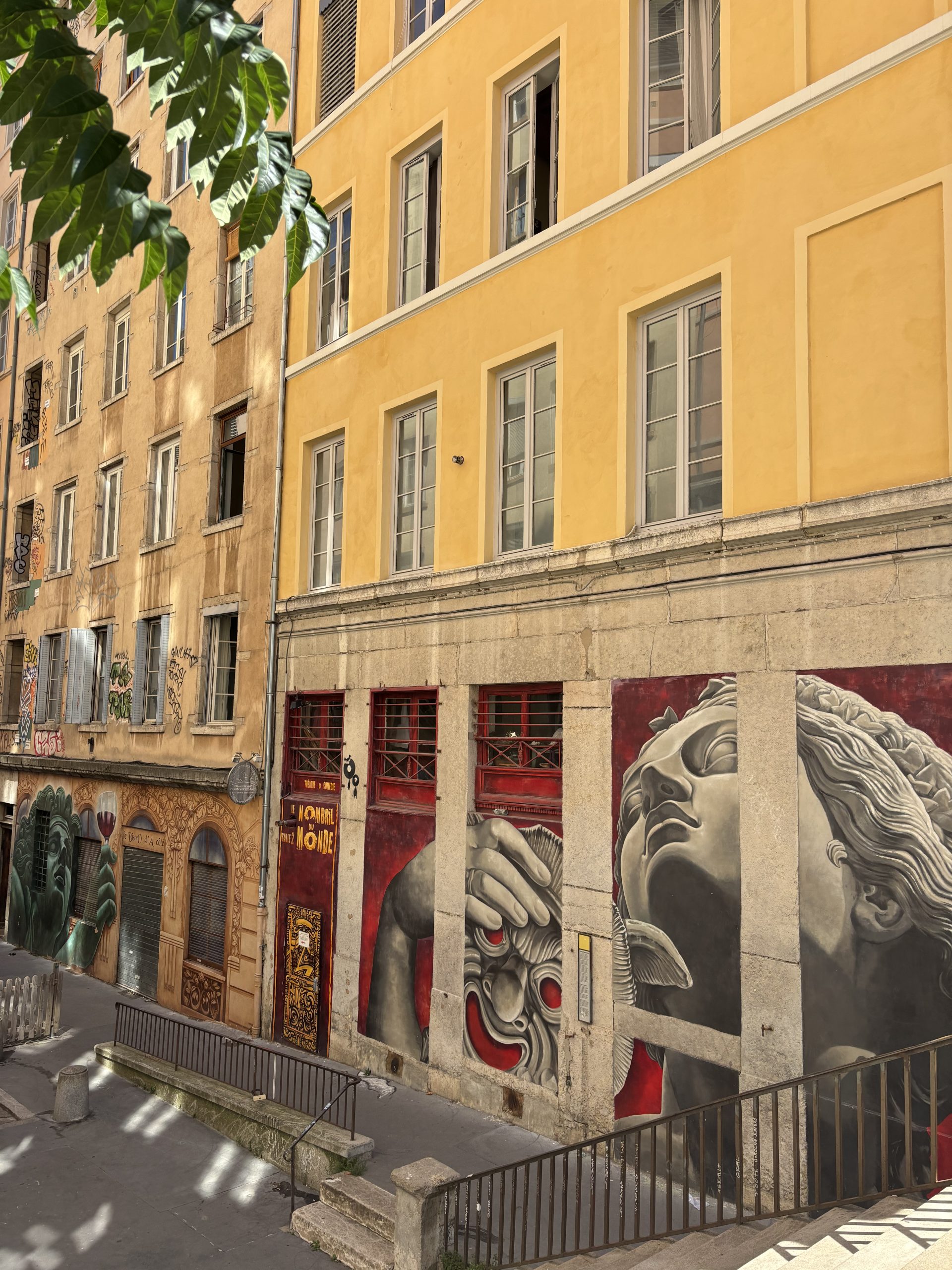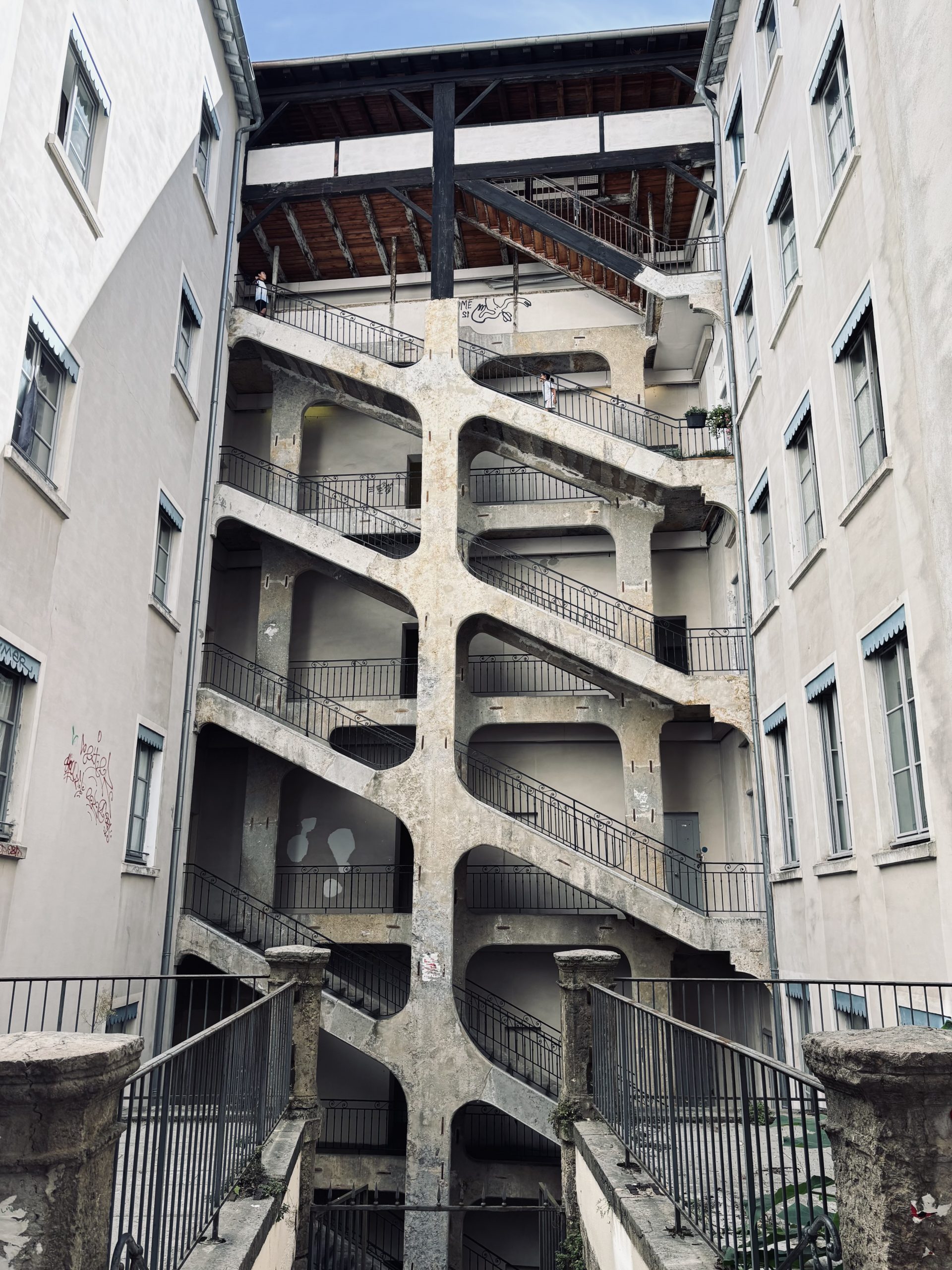 Statt außen um den Block herumzugehen, ließ sich von der Straße aus eine unscheinbare Tür öffnen – dahinter ein Hof, eine Galerie, ein Treppenhaus und schließlich ein Ausgang auf eine andere Straße. In Lyon soll es etwa 400 Traboules geben, von denen einige noch heute öffentlich zugänglich sind. Wir haben tatsächlich auch ein paar gefunden – es gibt wohl geführte Traboules-Touren…
