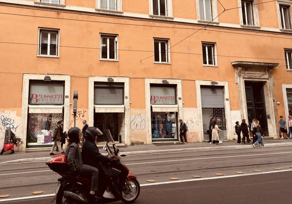 Gleich um die Ecke liegt mit Bassetti Tessuti* eine weitere Institution – wohl legendär unter römischen Schneider*innen, nicht zuletzt wegen der großen Auswahl, darunter auch Restposten von Luxuswebereien wie Loro Piana, Ermenegildo Zegna oder Vitale Barberis Canonico. Der Laden wirkte deutlich aufgeräumter, als ich gehört hatte, und auch hier bot mir sofort jemand Hilfe an, der glücklicherweise zudem Englisch sprach. Ich wiederholte: Kammgarn im gewünschten Gewicht.