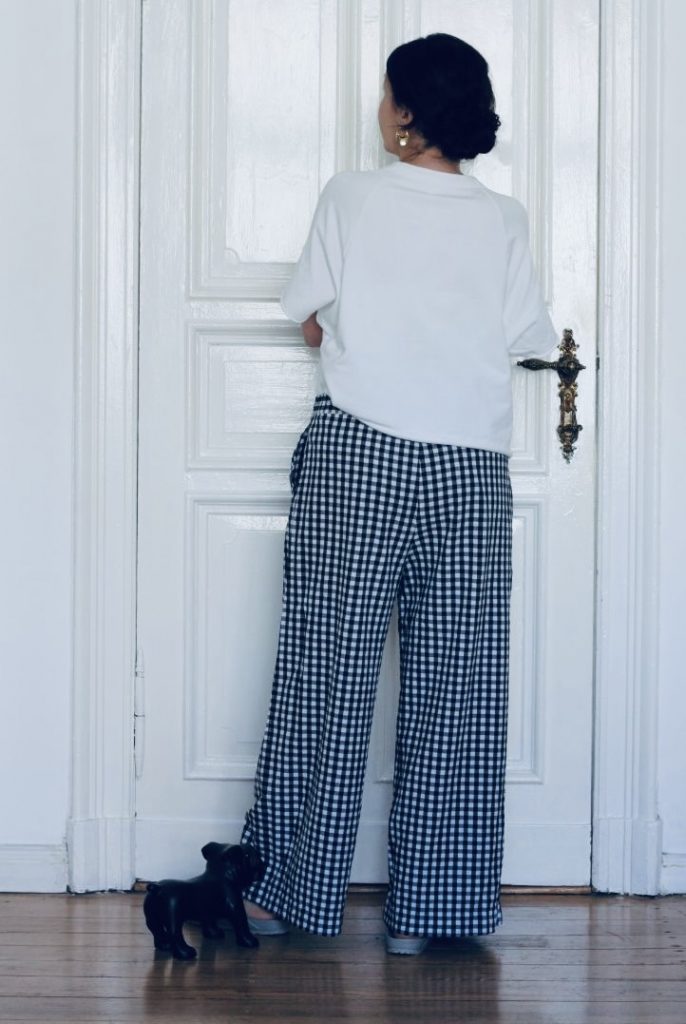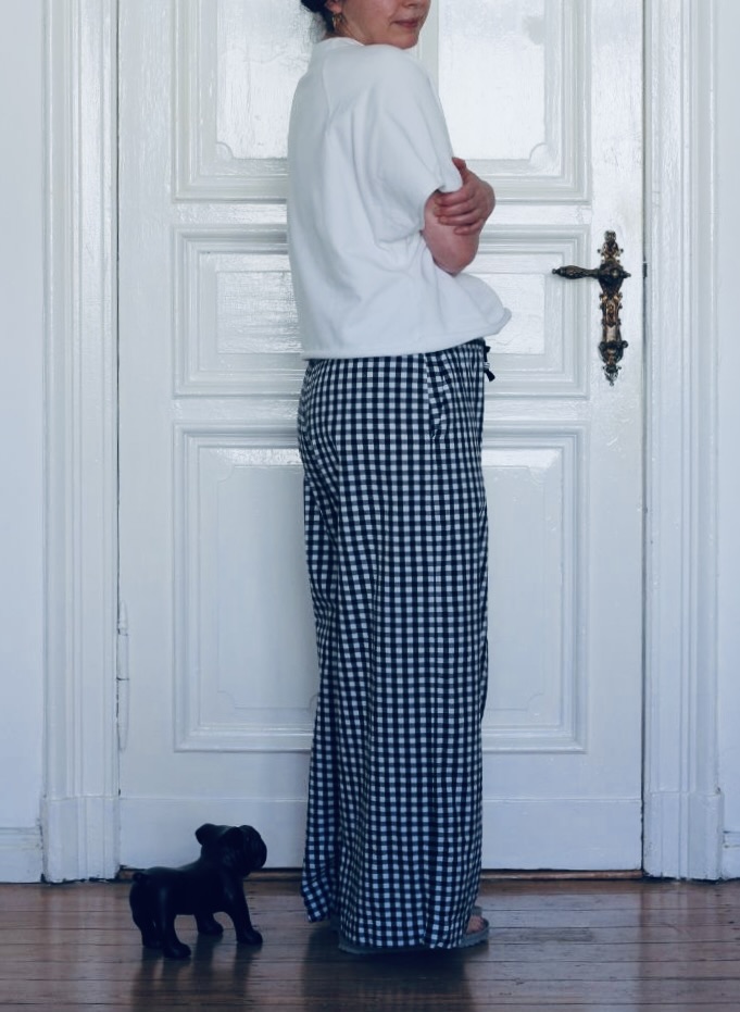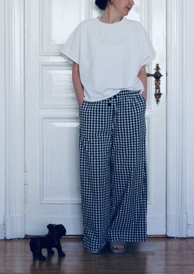 Weit geschnittene Hose mit Gummizug und Nahttaschen. Genäht in einem s/w Vichy Karo – ein BW-Coupon von Saint Pierre. Das Kordelband ist von Yavas und die Stopper von einem ausrangierten Bikini-Oberteil. Genäht in Gr. 48 (russische Größe) für die Länge 170-76 cm. Handwerklich gut gemachter Schnitt. Aber sicherlich gibt es vergleichbare auf dem Markt. Grasser 849 ist einer meiner Standardschnitte für Pyjamahosen.