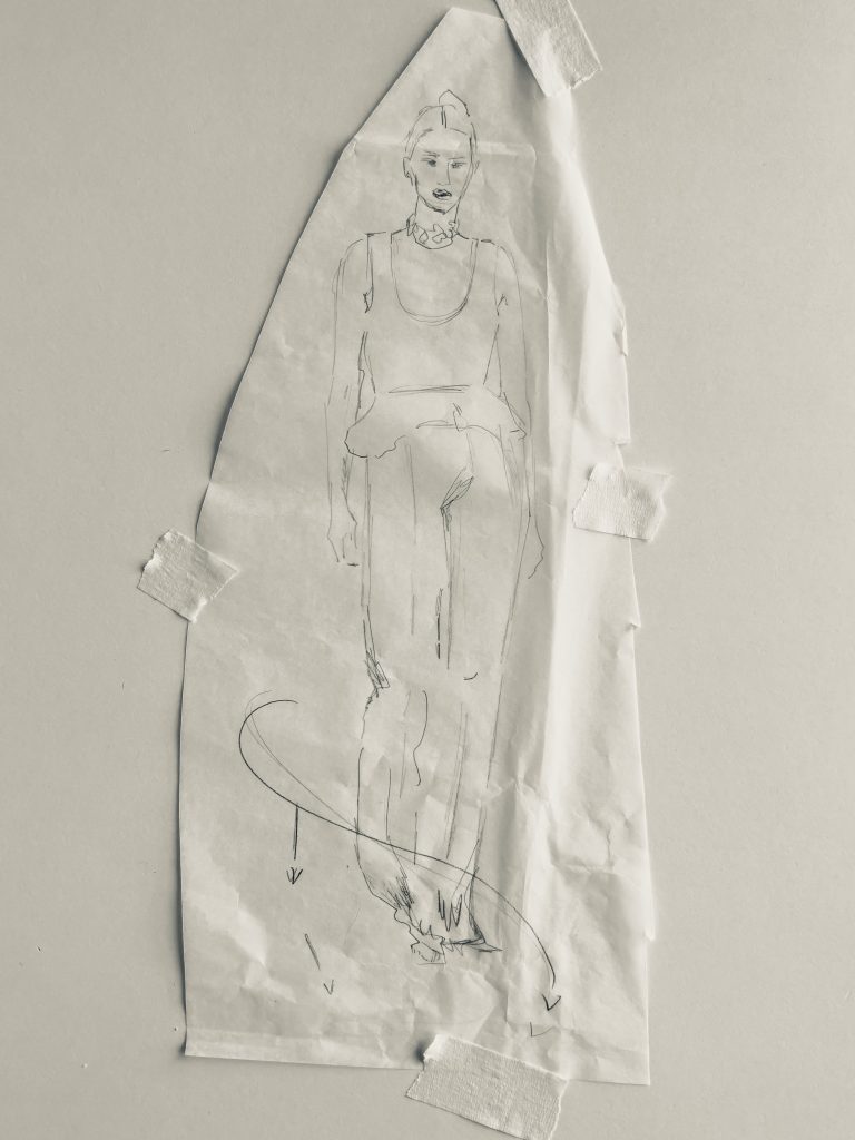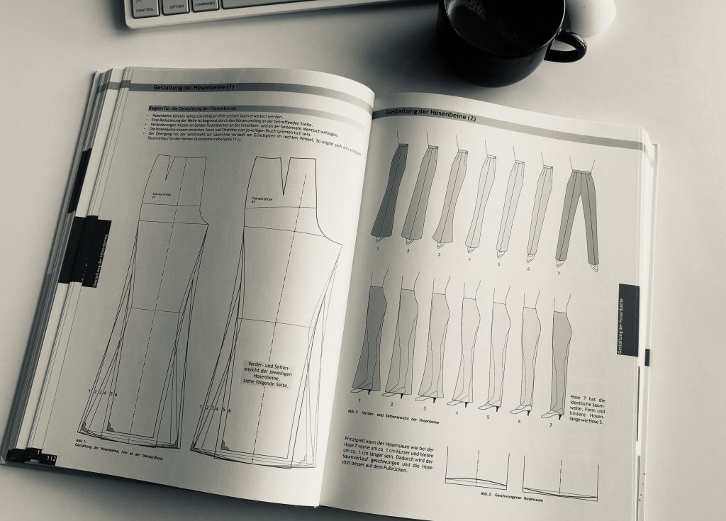 Bei diesem Probemodell habe ich mich zudem für Leibhöhe sowie Faltenbreite und -tiefe entschieden und einen Formbund gezeichnet, der sich hoffentlich wie ein gerader Bund liest. Darauf lässt sich aufbauen. Fehlen nur noch Ober- und Untertritt, die Taschen – und das Nähen der finalen Hose. Das ist doch schnell gemacht. Ha-ha. Ich hoffe, euch das fertige Modell Ende März zeigen zu können.