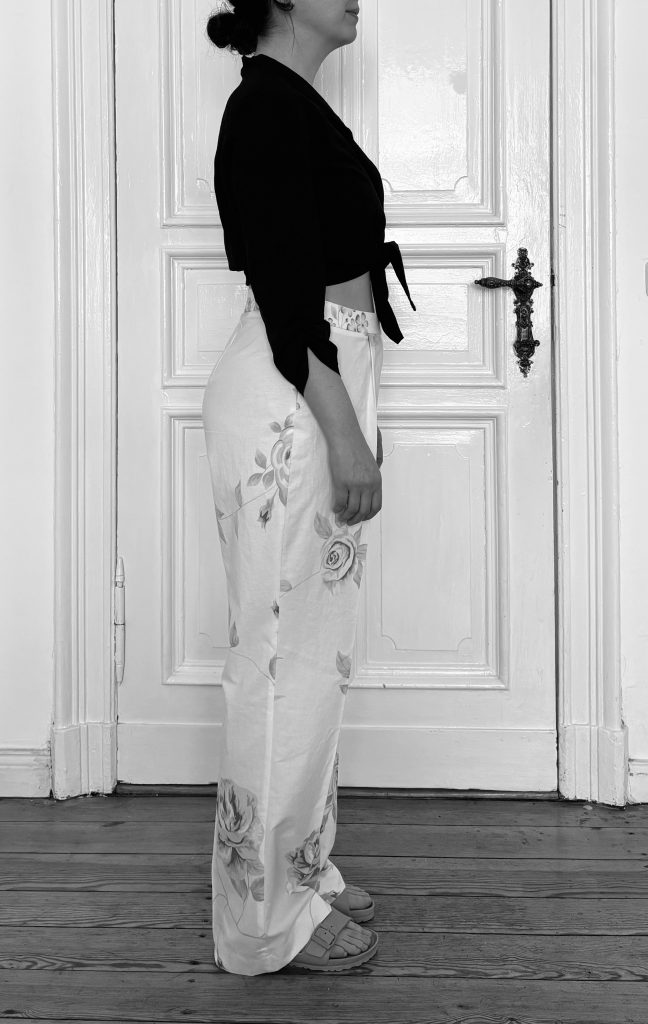 Hinzu kommt, dass meine körperliche Realität eine andere ist. Abgesehen vom Offensichtlichen, dass ich nicht die Maße eines Laufstegmodels mitbringe, unterscheiden wir uns auch in Proportion und Haltung. Der U-Ausschnitt des Tops würde bei mir bis zum Bauchnabel reichen, mein Becken ist sowohl runder als auch stärker geneigt. Die Hosenbeine der Givenchy-Hose dürften „straight cut“ sein. Wie die erste Version des Probemodells zeigt, führt ein Ausstellen und Begradigen der Seitennaht vom Oberschenkel zum Saum hin bei mir jedoch nicht zur gewünschten Wirkung: Die Weite fällt nicht, sondern sammelt sich seitlich.