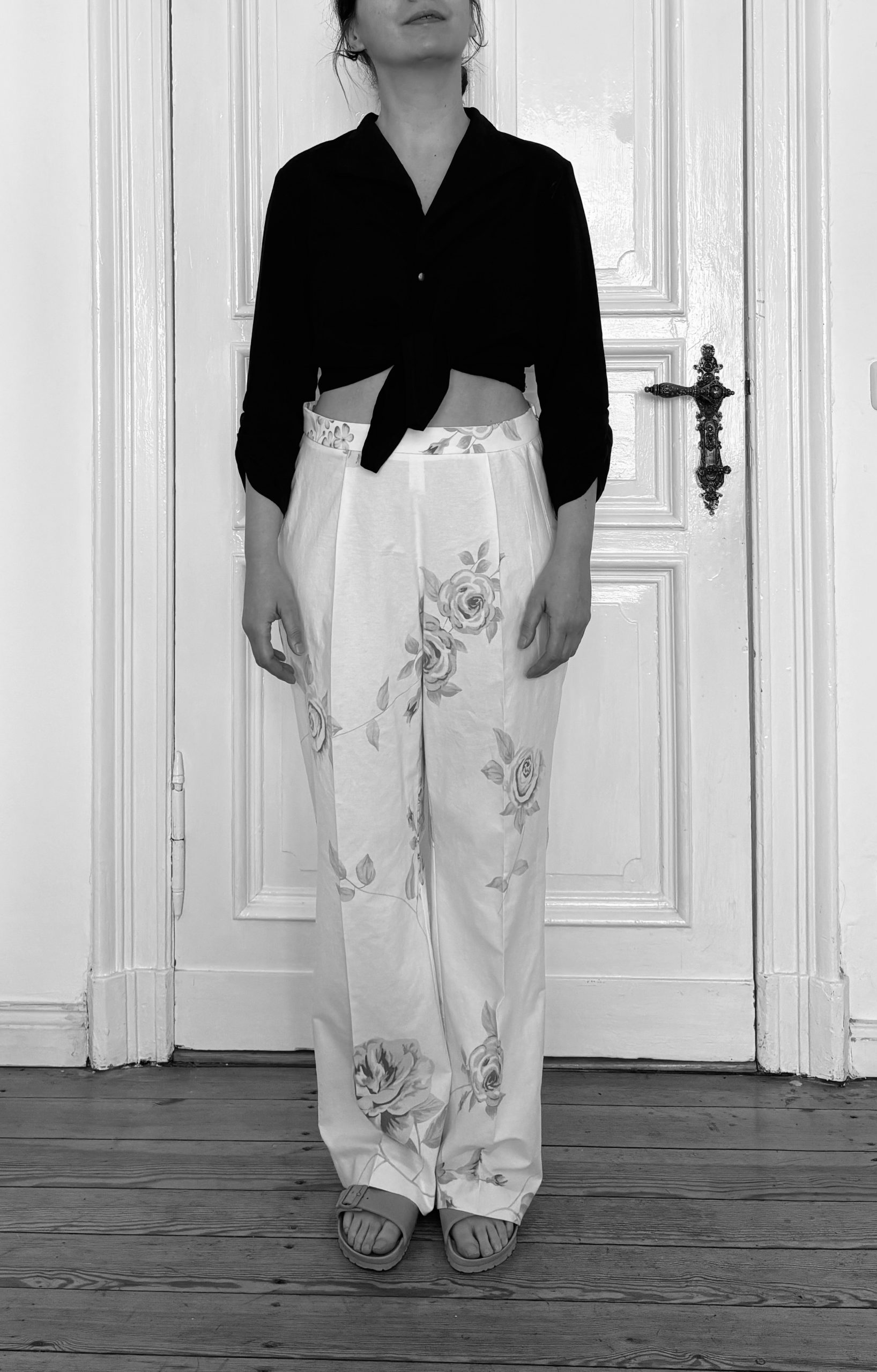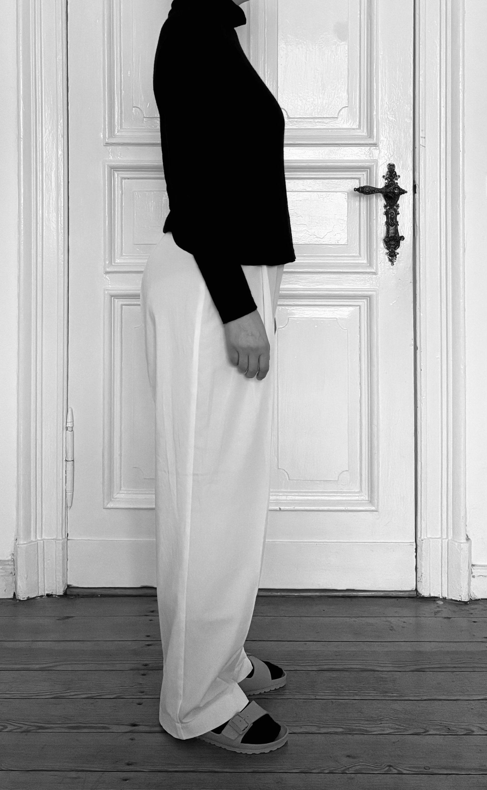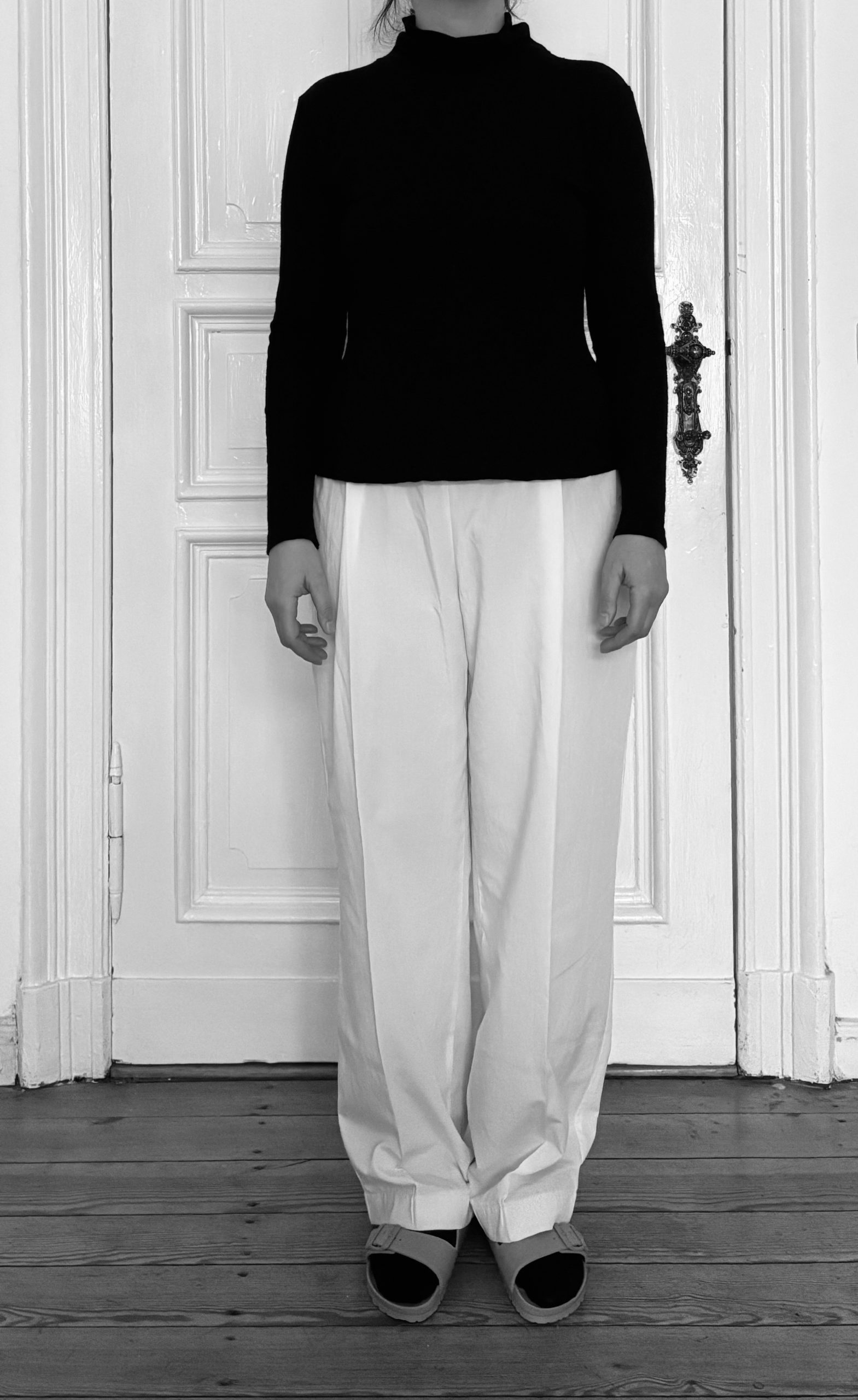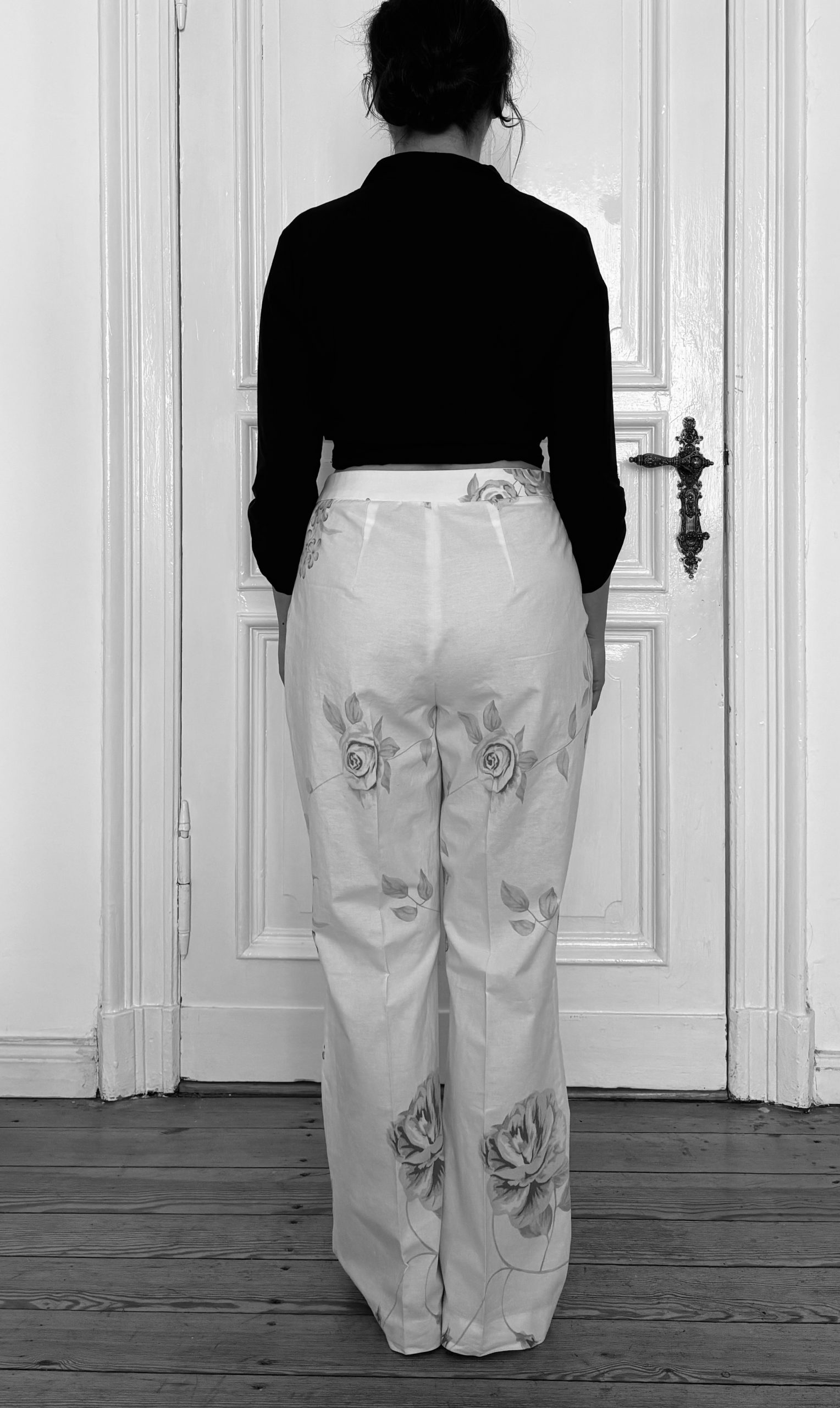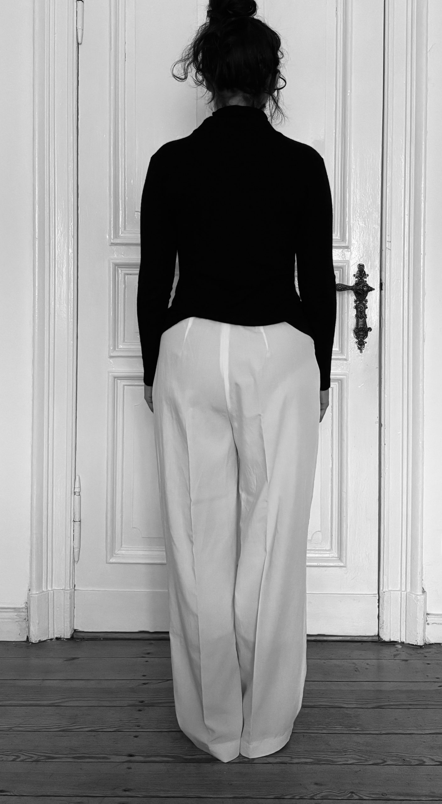 Hinzu kommt, dass meine körperliche Realität eine andere ist. Abgesehen vom Offensichtlichen, dass ich nicht die Maße eines Laufstegmodels mitbringe, unterscheiden wir uns auch in Proportion und Haltung. Der U-Ausschnitt des Tops würde bei mir bis zum Bauchnabel reichen, mein Becken ist sowohl runder als auch stärker geneigt. Die Hosenbeine der Givenchy-Hose dürften „straight cut“ sein. Wie die erste Version des Probemodells zeigt, führt ein Ausstellen und Begradigen der Seitennaht vom Oberschenkel zum Saum hin bei mir jedoch nicht zur gewünschten Wirkung: Die Weite fällt nicht, sondern sammelt sich seitlich.