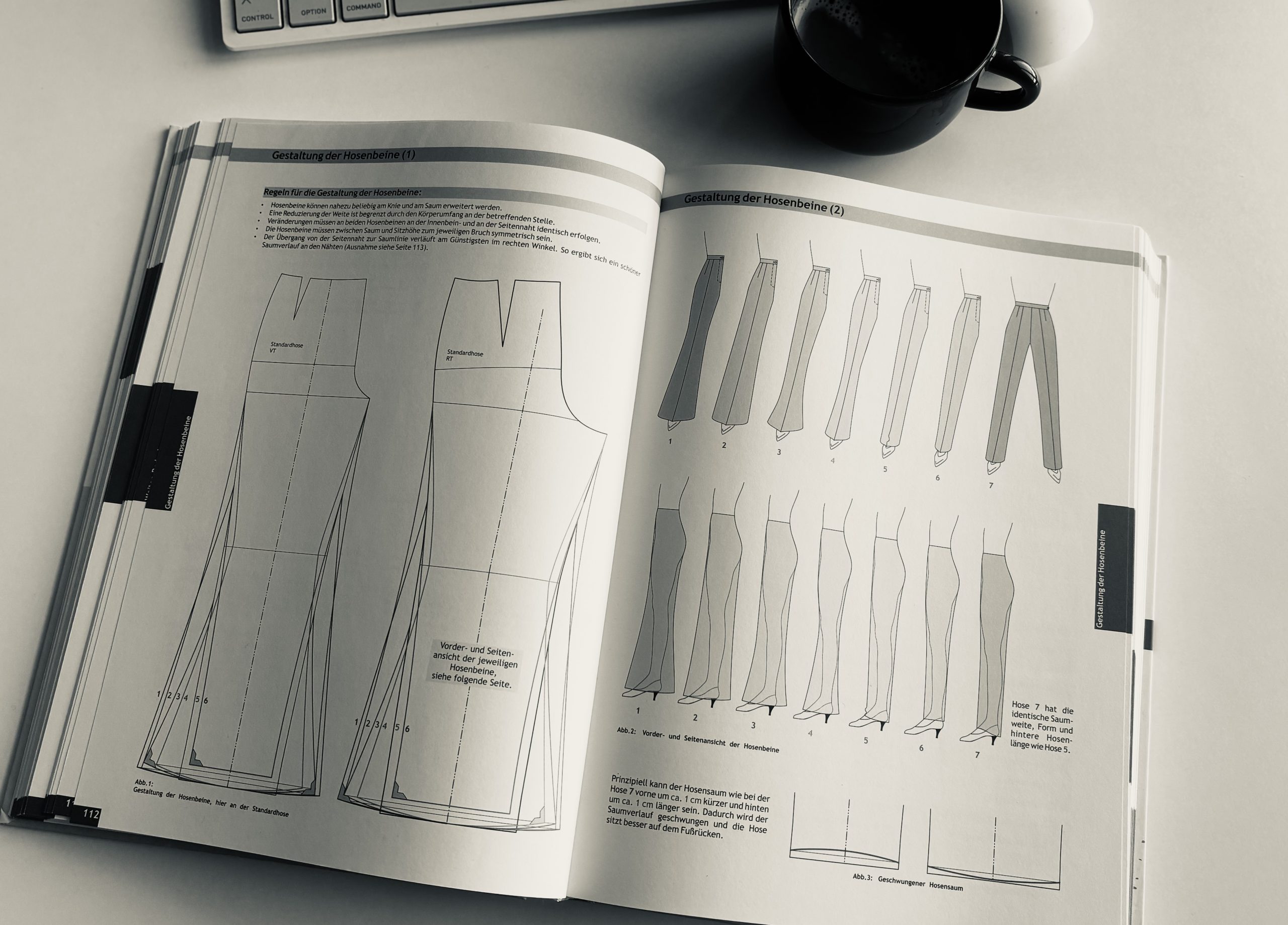 Bei dem Blick in das Schnittkonstruktionsbuch hätte ich auch eher auf die Silhouette ganz links getippt. Könnten die diagonalen Spannungsfalten eventuell an zuviel Stoff an der Oberkante auf Höhe der Abnäher liegen? In der Mitte sieht ja alles gut aus, vielleicht passt die Rundung der Hosenoberkante nicht ganz zur Rundung des Formbundes.